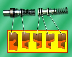 14. Собираем главный тормозной цилиндр в обратной последовательности. Но перед этим нужно смазать детали главного цилиндра новой тормозной жидкостью. При установке манжет на поршни рабочие кромки нужно сориентировать так, как отображено на фото: