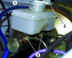 2. Затем отсоединяем колодку №2 с проводами от датчика уровня тормозной жидкости, который установлен в крышке №1 бачка главного цилиндра, после чего снимаем крышку. Откручиваем крепежные гайки №3 и отсоединяем от главного цилиндра трубопроводы. Также необходимо заглушить отверстия трубопроводов.