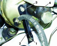 3. Откручиваем крепежный болт №1 кронштейна №2 усилителя к брызговику. Далее откручиваем две крепежные гайки №3 главного тормозного цилиндра №4 к вакуумному усилителю, снимаем главный цилиндр с кронштейном. Следим за тем, чтобы не выпал резиновый уплотнитель между вакуумным усилителем и цилиндром.