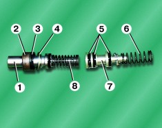 7. Из цилиндра извлекаем первичный поршень №1 в сборе. Затем вынимаем цилиндр из тисков, аккуратно постукиваем торцом о чистую деревяшку и извлекаем вторичный поршень №7 с пружиной №6. Снимаем направляющую втулку №2 с первичного поршня, затем наружную манжету №3 и упорное кольцо №4. Регулировочный винт, который крепит держатель пружины №8, без необходимости откручивать не стоит. Снимаем манжеты №5 с вторичного поршня.