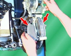 13. Устанавливаем тормозные колодки на основание скобы, причем следим за тем, чтобы нажимные пружины находились вертикально вверх и параллельно верхнему краю тормозных колодок. Если устанавливаются старые колодки, это делается в соответствии с ранее сделанной маркировкой.