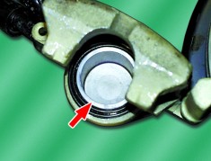 12. При установке новых тормозных колодок следует осторожно вдавить в цилиндр поршень. При этом следим, чтобы поршень не перекашивался.
