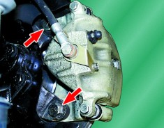 1. После того, как переднее колесо снято, откручиваем два крепежных болта, снимаем тормозную скобу в сборе и подвешиваем ее на проволоке к кузову, причем следим за тем, чтобы тормозной шланг не был перекручен и не испытывал лишних нагрузок.