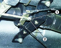 3. Откручиваем контргайку №1 и отпускаем регулировочную гайку №2 уравнителя, тем самым ослабив с соответствующей стороны натяжения троса привода стояночного тормоза.