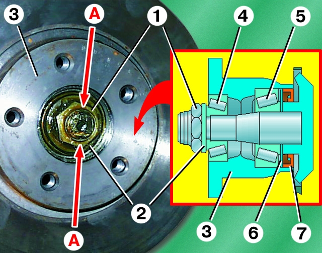 6. Откручиваем ступичную гайку №1, выправив замятые края «А», и снимаем упорную шайбу №2. Далее с цапфы поворотного кулака снимаем ступицу №3. Вынимаем наружный подшипник №4 из ступицы, а также сальник №7, упорную шайбу №6 и внутренний подшипник №5. После этого очищаем от смазки ступицу и выпрессовываем наружные кольца подшипников.