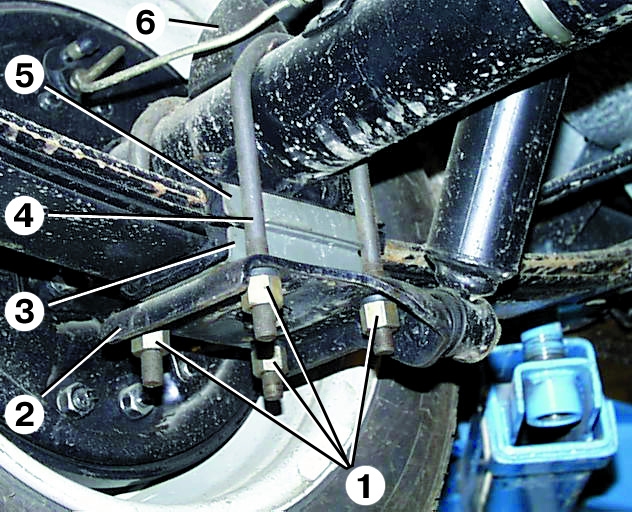 3. Затем откручиваем четыре гайки №1 стремянок рессор. Снимаем подкладку рессоры №2, потом нижнюю обойму №3 вместе с подушкой, стремянки №4, буфер №6 задней подвески, а также верхнюю обойму №5 с подушкой.
