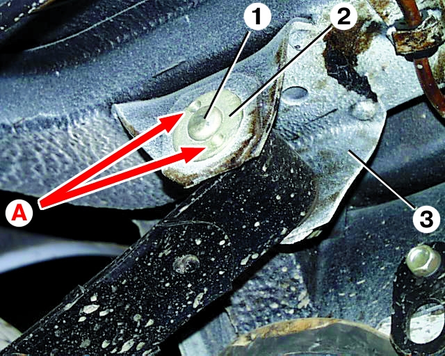 5. В случае необходимости нужно отцентрировать палец №1 и шайбу №2 с отверстием кронштейна №3. Вкручиваем в резьбовые отверстия А шайбы пальца два технологических болта. Обильно смачиваем втулки и палец тормозной жидкостью либо мыльным раствором. Между технологическими болтами вставляем мощную отвертку или монтировку, проворачиваем в обе стороны палец и добиваемся свободного проворота пальца во втулках. Затем накручиваем гайку на палец №1 заподлицо и с помощью ударов молотка выбиваем палец до касания гайки кронштейна №3. Прикладывая усилие к торцу пальца, откручиваем гайку и полностью выбиваем палец бородком. Выводим из кронштейна передний конец рессоры.