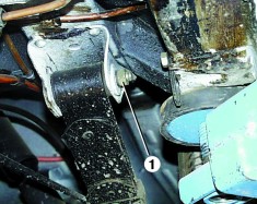 4. Откручиваем гайку №1 пальца фиксации переднего конца рессоры к кронштейну кузова, после чего снимаем пружинную шайбу.