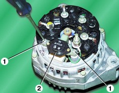 7. Откручиваем два винта №1 и снимаем щеткодержатель №2 вместе с регулятором напряжения.