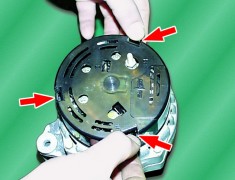 6. Для ремонта генератора его следует разобрать. Для этого сначала очищаем генератор от грязи и пыли. Потом, отжав 3 защелки, снимаем заднюю крышку.
