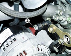 15. После установки генератора регулируем натяжение ремня привода генератора. Для этого ослабляем затяжку болта №1. Откручиваем либо закручиваем болт №2, регулируя натяжение ремня. Окончательно затягиваем болт №1. Обязательно проверяем прогиб ремня.