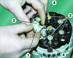 8. Затем откручиваем крепежный винт и снимаем конденсатор, который установлен под щеткодержателем. Отсоединяем колодку №1 с проводом от конденсатора №2. Потом откручиваем четыре винта №3, отгибаем выводы №4 обмотки, а затем снимаем выпрямительный блок.