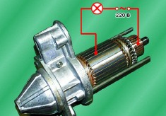 13. Очищаем все детали стартера. Затем проверяем состояние обмотки статора. Для этого включаем контрольную лампу в цепь переменного тока напряжением 220 В и подсоединяем к любому выводу обмотки статора, а другой конец цепи замыкаем на корпус статора. В этом случае лампа не должна гореть. В противном случае повредилась изоляция обмотки. Здесь придется или менять обмотку или статор. Аналогично проверяется вторая обмотка.