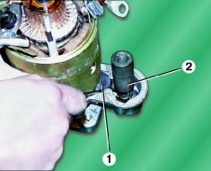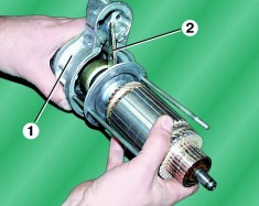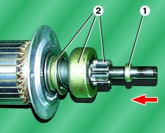 12. После этого сбиваем удерживающее кольцо №1 через оправку по направлению стрелки. Стопорное кольцо, которое установлено под удерживающим, можно снять. Снимаем привод №2 стартера в сборе с вала якоря.