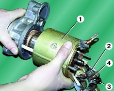 9. Снимаем статор №1 вместе с щеткодержателем №2. Для отсоединения щеткодержателя от статора отжимаем концы пружин №3 и вынимаем две изолированные щетки №4 из держателей (данные щетки должны остаться на выводах обмотки статора).