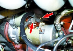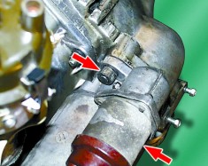 3. Откручиваем две верхние и нижние крепежные гайки и снимаем стартер. На двигателе ЗМЗ–402 заранее выворачиваем направляющую трубку щупа (указателя) уровня масла.