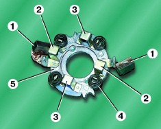 18. После этого проверяем перемещение щеток №1 в держателях №2 и №3 — щетки обязаны перемещаться без заеданий, легко. Проверяем надежность крепления щеточных держателей №2 и №3 — они болтаться не должны. Держатели №3 изолированных щеток не «замыкаться на массу» (проверяем контрольной лампой). При помощи динамометра проверяем усилие пружин №4, которые прижимают щетки. Для этого со стороны коллектора устанавливаем щеткодержатель №5 в крышку, вставляем якорь и устанавливаем щетки на коллектор. Во время отрыва пружины от щетки усилие должно быть от 8,5 до 14 Н. Концы пружин нажимают на середину щетки. Щетки подлежат замене в случае изношенности до высоты 5,0 мм.