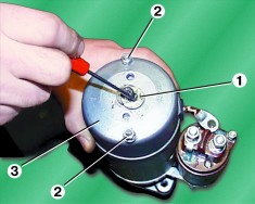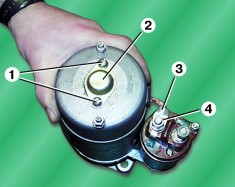 5. Откручиваем два винта №1 и снимаем крышку №2. Затем откручиваем гайку №4 и отсоединяем от клеммы тягового реле шину №3.