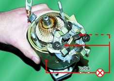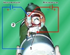 17. Теперь проверяем сопротивление обмоток тягового реле при помощи омметра. Сопротивление удерживающей обмотки должно находиться в интервале 1,03–1,11 Ом, а втягивающей — 0,300–0,345 Ом. Обмотка также проверяется, если к выводам обмоток подсоединить аккумуляторную батарею. Чтобы проверить втягивающую обмотку, отсоединяем от контактного болта №1 тягового реле клемму. Далее подсоединяем «минус» АКБ к клемме №2, а «плюс» — к контактному болту №1 (на фото красная схема). Здесь релейный якорь должен резко втянуться. Чтобы проверить удерживающую обмотку (при отсоединенной клемме от контактного болта №1), «плюс» батареи подсоединяем к клемме №2, а «минус» – к корпусу стартера. Здесь релейный якорь должен плавно втянуться. Иначе меняем тяговое реле. Якорь тягового реле обязан передвигаться в корпусе без заеданий, свободно. Осматриваем контактные болты. Зачищаем подгоревшие головки болтов с помощью мелкой шкуркой. Если головки болтов сильно выгорели, разворачиваем болты на 180°, для прилегания их не выгоревшей стороной к контактному диску. А при сильной изношенности поверхности контактного диска, поворачиваем его к контактным болтам неизношенной стороной.