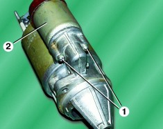 8. Воспользовавшись отверткой, вынимаем резиновое уплотнение №1 рычага. Затем снимаем якорь №2 тягового реле. Чтобы это сделать, необходимо нажать вниз на якорь №2, после чего отсоединить от рычага.